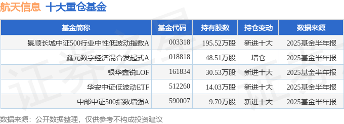 持有航天信息最多的基金为景顺长城中证500行业中性低波动指数A,目前规模为8.24亿元,最新净值1.6052(8月28日),较上一交易日上涨1.33%,近一年上涨35.92%。该基金现任基金经理为曾理。